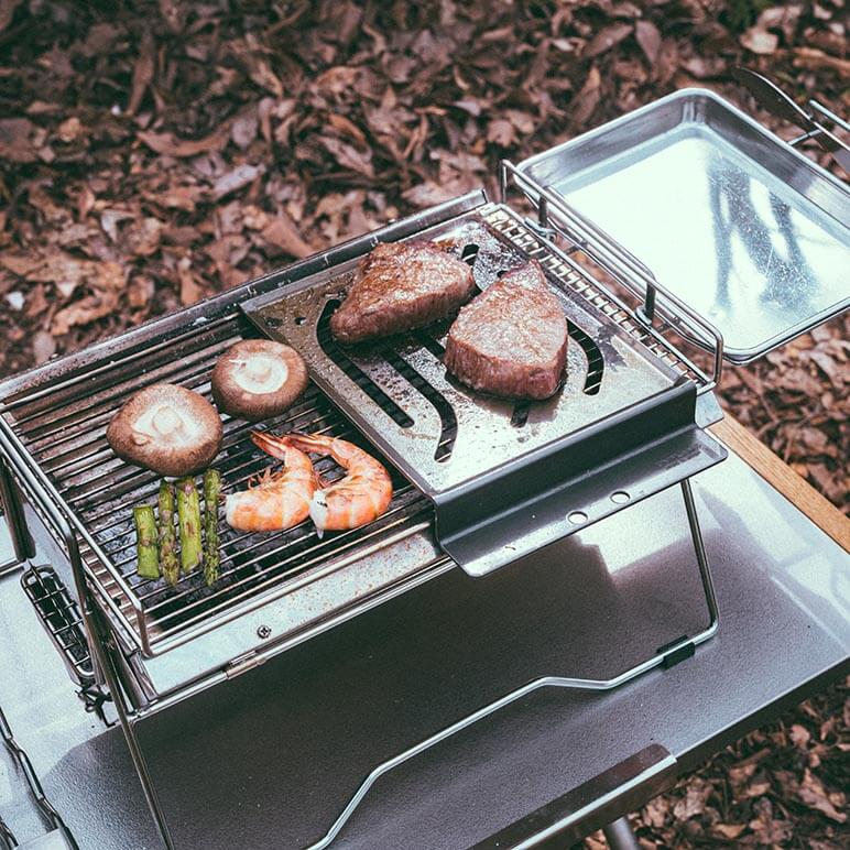 ちょっとした焼き料理を楽しみたい方にはこのセット!このユニセラ鉄板スリッドなら[1]スリッドが余分な脂をカット [2]鉄板で中まで熱を伝える [3]炭火の輻射熱で旨みを逃がしません。この3点をクリアする組み合わせはなかなかないので、キャンプ飯にこだわるあなたはぜひ一度その舌で体験してみては。