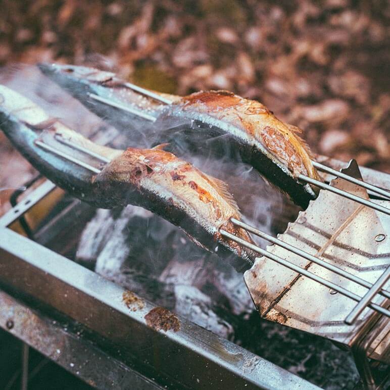 ユニセラ焼鳥台IIを使えば、串の持ち手を焦がすことなく焼き鳥を焼くことができます。写真は焼き鳥台に付属している魚焼き用串置きを使ってサンマを焼いてみました。この魚焼き用串置きを使う場合はツインスキュアー270を使用します。サンマの脂がたくさん出てくるので、待っている間は「空腹」との勝負です!