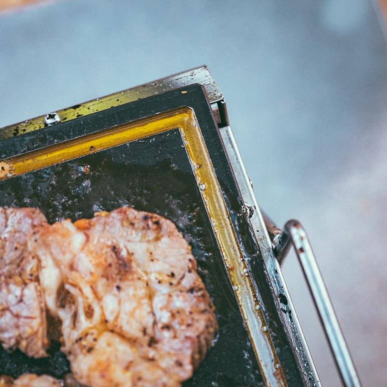 鉄板と言えば、やっぱり「肉」!ステーキ肉や分厚い食材を焼くときは『クロテツ』と『ユニセラ』がおすすめ! 手に入りやすい安めの硬いお肉も旨味たっぷり、柔らかくなり美味しく食べることができます。それは4.5mmの極厚鉄板の蓄熱性とユニセラの放つ遠赤外線の効果でじっくりゆっくり焼きあがるからです。その結果、旨味を逃がさず肉の中までしっかり火を通すことができます。この方法で、肉だけでなくいろいろな食材の旨味を楽しんでみては?