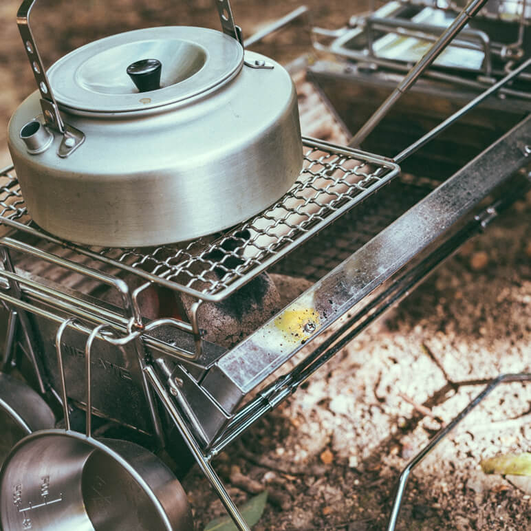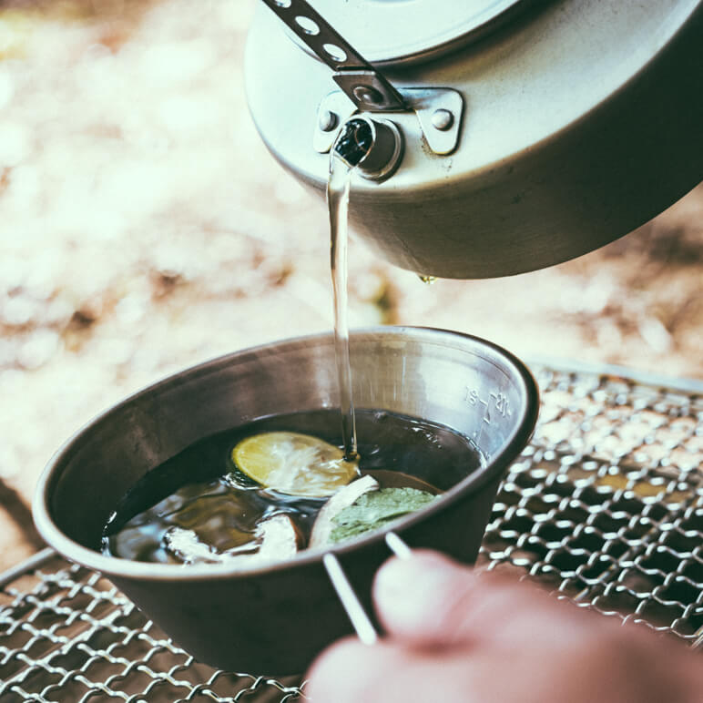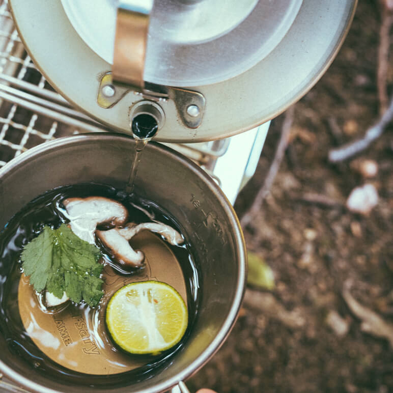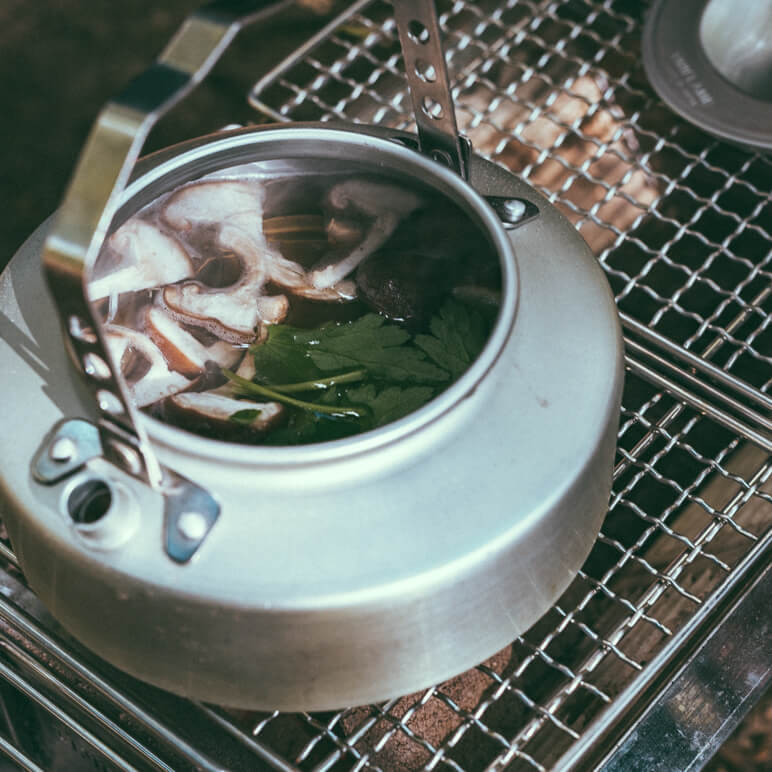 ユニフレーム社員の方々が、秋冬シーズンに『ユニセラ』で作る、土瓶蒸しにチャレンジ!白だしで好みの味にして『ユニセラ』にセット。沸騰するのをじっくり待ちます。この待っている時間も普段感じることができない特別な時間。『ウィング網』を使えば片方だけに炭を寄せることができるので、沸騰したら遠火にして、ミツバとすだちを入れましょう。湯気と一緒にほのかに香るダシが季節を感じさせてくれます。体を温めてくれることはもちろんのこと、気分もリフレッシュ♪