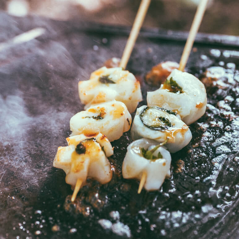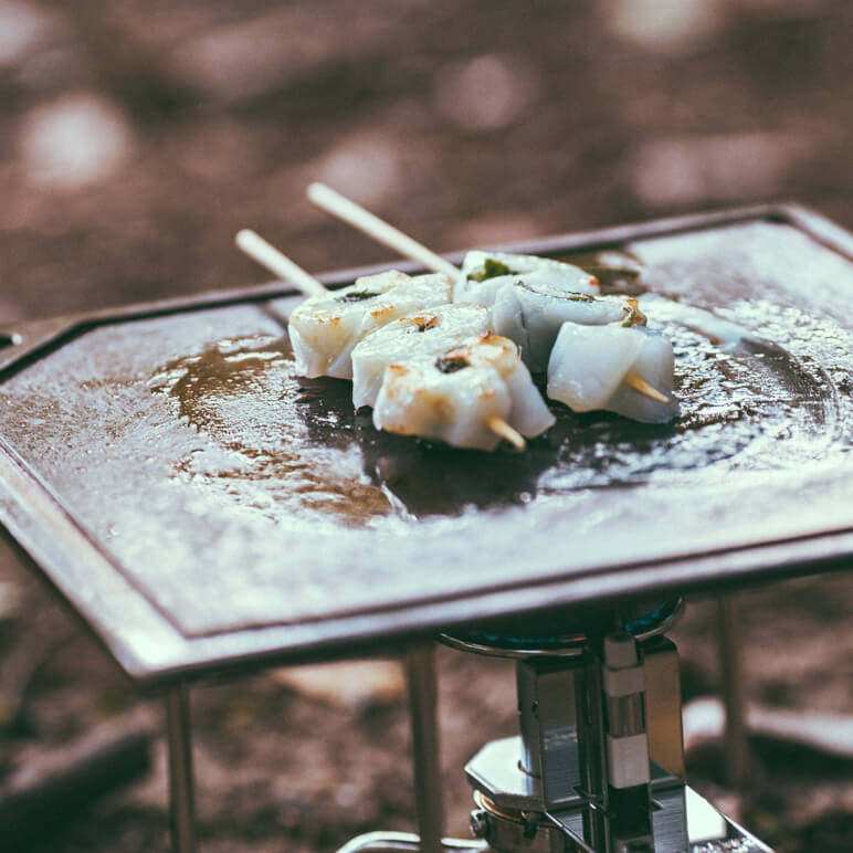 ユニフレーム社員の方々がオススメする『US-S』×『クロテツ』を使った、紋甲イカの大葉包みにチャレンジ!紋甲イカのサクに隠し包丁を入れ、その逆側に大葉を敷き、1~1.5cm間隔で切って串に刺します。クロテツにバターを落とすと早速バターの香りがして食欲を掻き立てられます。焼き目がついたら、醤油をかけるとさらによい香りが♪(クロテツを汚したくない方はお皿で醤油をかけてください)。大葉を包む一手間がありますが、とても美味しいので是非やってみてください。