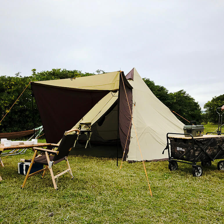 メインとなるワンポールテントは、ロゴスに別注したナチュラムだけの限定デル!基本的にはフライ&インナーの二重構造ですが、インナーサイズをあえてフライの半分にして、前室に居住空間を作りました♪そのスペースをどう使うかはアナタ次第!?おしゃれに飾ってみてください♪