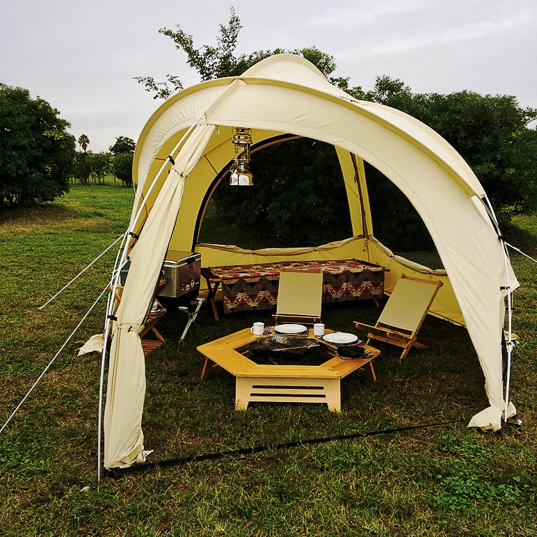 必要最低限のギアだけでキャンプをするのも通ですよ!サイトはナチュラルカラーで統一!ポイントでペンドルトンの独創的なカラーが映えますね!!