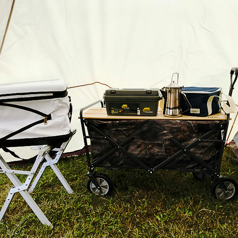 テントの前室にはキャリーワゴンだって余裕で入ります。ただ、そのまま入れてしまうとスペースが勿体ないので、ロールボードを載せて無駄なく活用しちゃいましょう♪