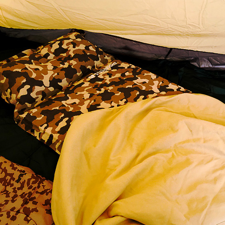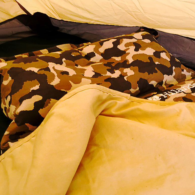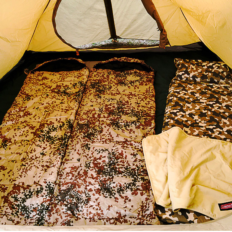 テント内までこだわるなら、こんなマットはいかがでしょうか?枕付きのスエードマットにカモ柄を載せた限定マットは、最高級の寝心地をプレゼント。肌触りの良い生地の性質上、夏はブランケットをかけるだけで寝袋いらず♪