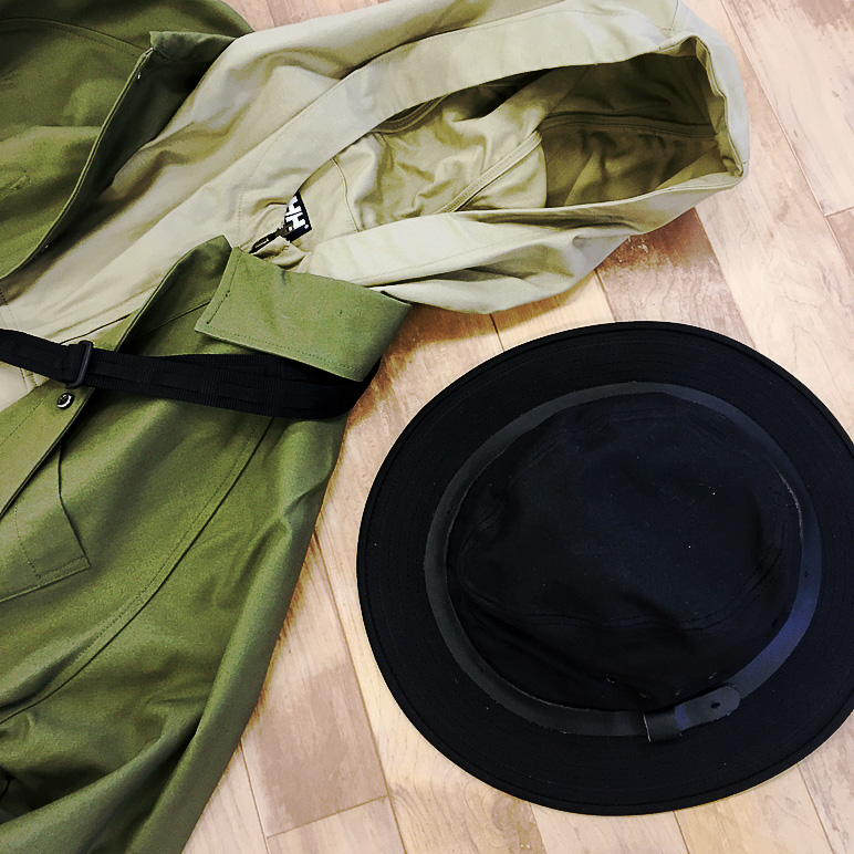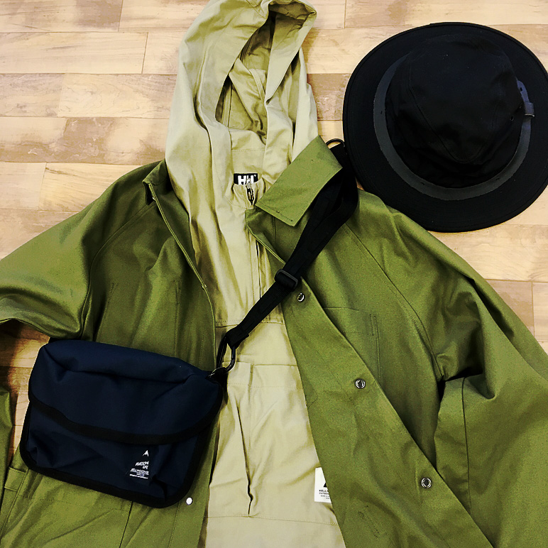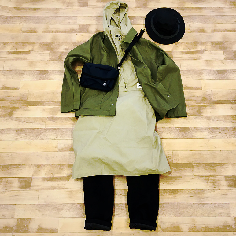 特殊な形のエプロンは、一見コーディネイトし難いかな?と思いがちですが、ワークジャケットやダウンベストとの相性バツグン。少し容量の大きいサコッシュでカッコよく合わせるのもアリ。フィルソンのハットがぼんやりしたコーディネイトをしめてくれます。