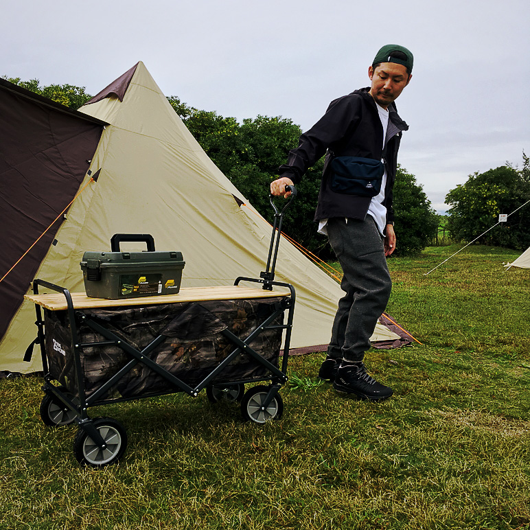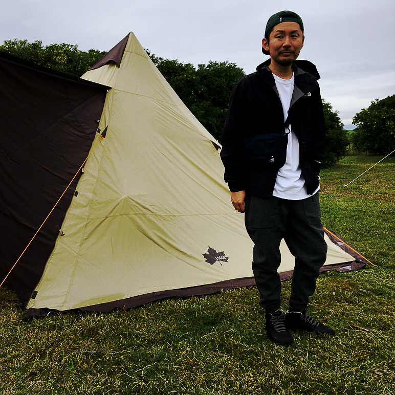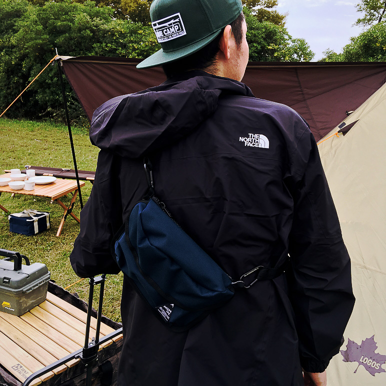 ノースフェイスの軽量防水透湿ジャケットで急な雨にも対応!中にはダウンジャケットを着込んで冬キャンプも楽しんでいただけます。少し容量の大きいサコッシュでカッコよく合わせるのもアリ。