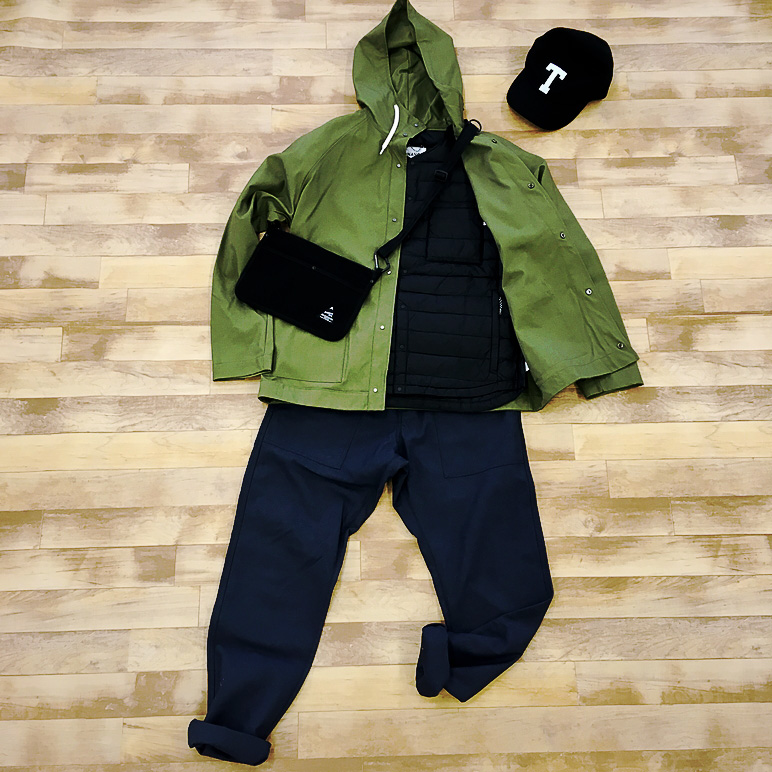 無難な組み合わせですが、間違いなくオシャレ。またジャケットもパンツも難燃で焚き火対策バッチリ。シンプルなキャップもアクセントに!インナーダウンを着用することで秋冬のキャンプにもオススメなスタイル。