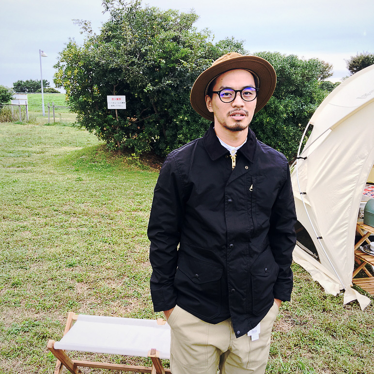 これぞ大人!なちょっと渋めなスタイル。キャップはフィルソン。ジャケットはバブアーを着用。バブアーのオイルドジャケットは焚き火にも強いので、焚き火対策としても使えます。また、パンツも難燃素材なので大人渋いスタイルで完全焚き火対応スタイルです。