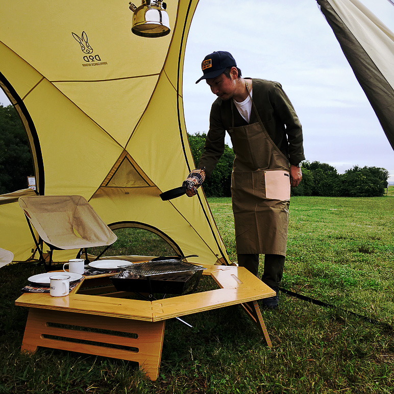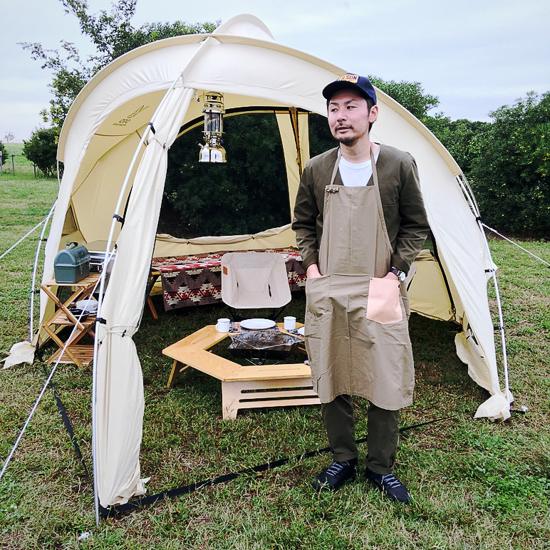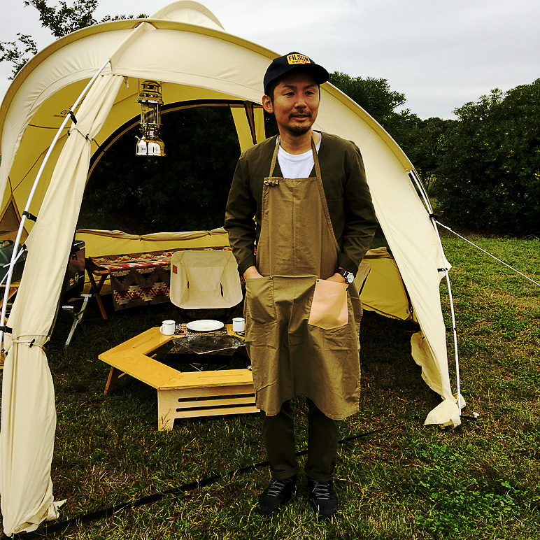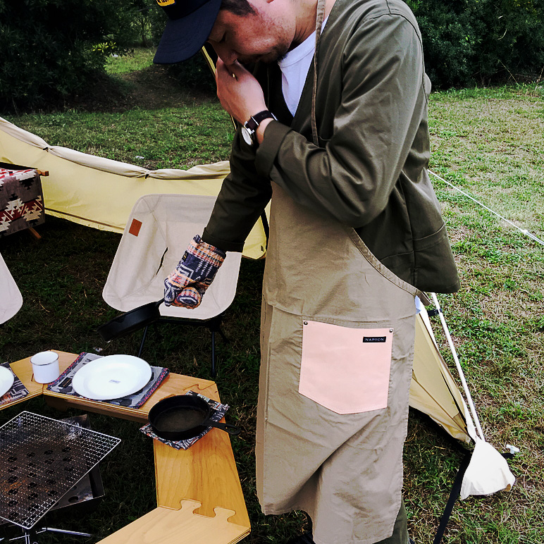ナチュラルなカラーリングでコーディネイトをまとめました。カーキとベージュに組み合わせは今流行りの色使い。エプロンはポイントで革を使用している為、経年劣化も楽しんでいただけるのが特徴です。フィルソンのキャップをアクセントで。