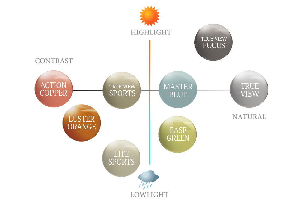 自然な見え方のトゥルービューに物体の輪郭を強調するコントラスト性能を付加。視界の色調変化を極力抑えたまま、アングラーが必要とする情報を映 し出すオールマイティな使用感は、様々なフィールドでストレスの無い視界を確保する。